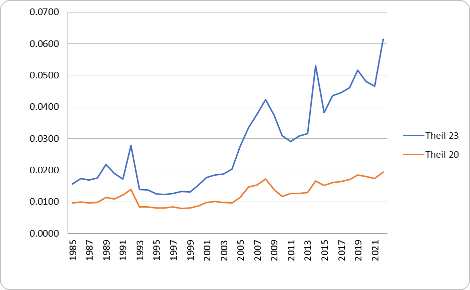 I calculated Theil indices with this dataset and corroborate their findings: the differences between two Theil sets (23 wards as a whole and another set without the three richest wards as of 2022) are significant. In my analysis, however, I swap Chuo with Shibuya, which is the ward with the third highest taxable income.