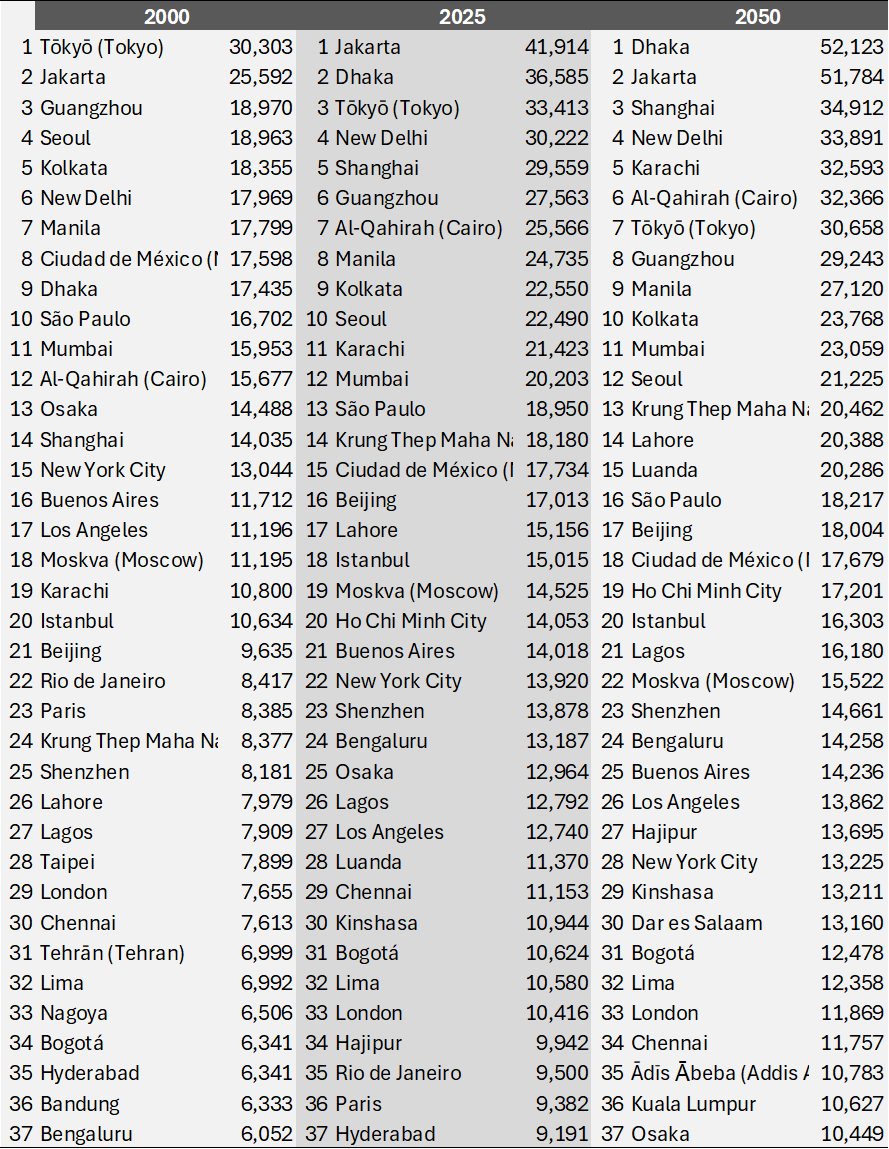 I put some figures in the following table (37 cities = 37 megacities by 2050), showing the changing and growing guard of megacities, all drawn from the most recent dataset.